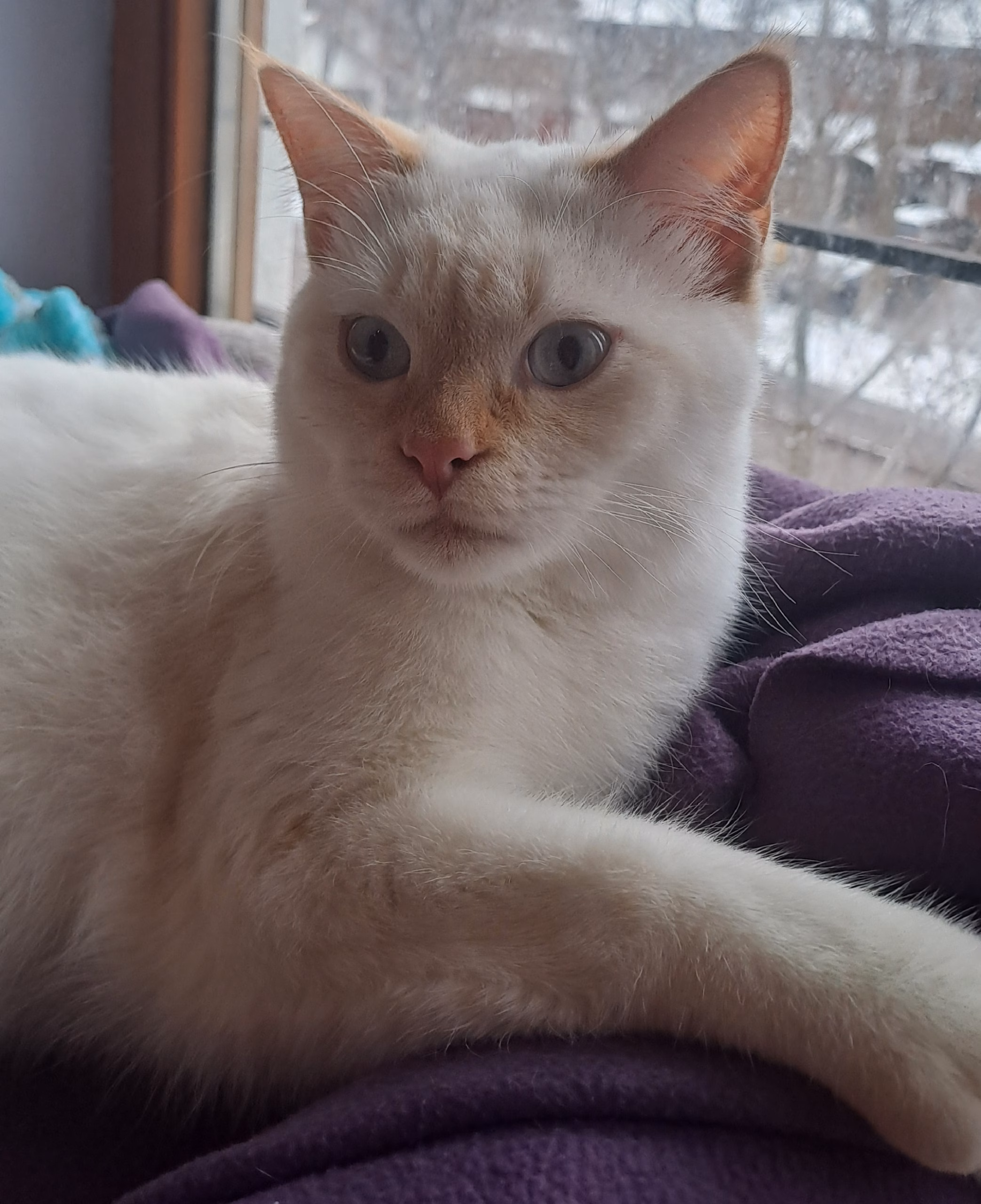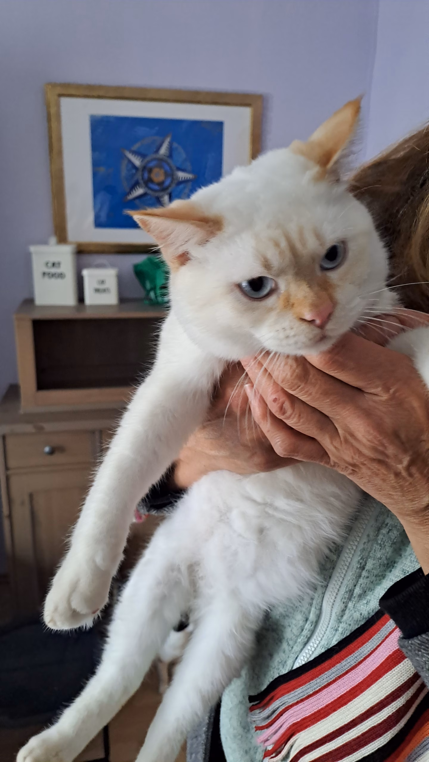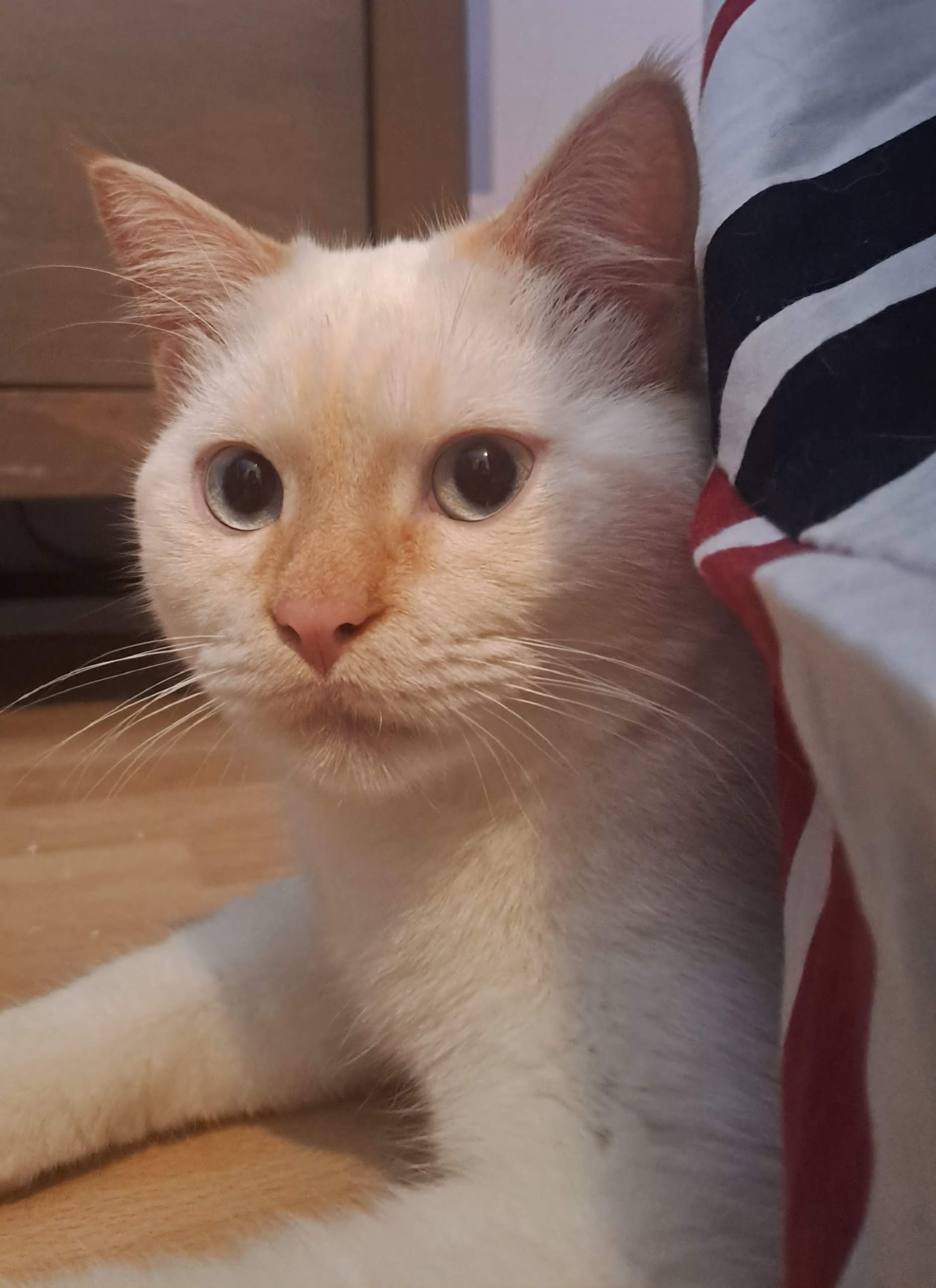 Espinho ist ein außergewöhnlich hübscher junger Kater mit strahlend hellblauen Augen. Er wurde im Juni 2025 in Madrid (Spanien) geboren und ist ein Siam-Apricot-Mix, möglicherweise mit Britisch-Kurzhaar-Anteilen. Sein dichtes, sehr weiches Fell und seine kräftige Statur lassen vermuten, dass er einmal ein stattlicher Kater wird.