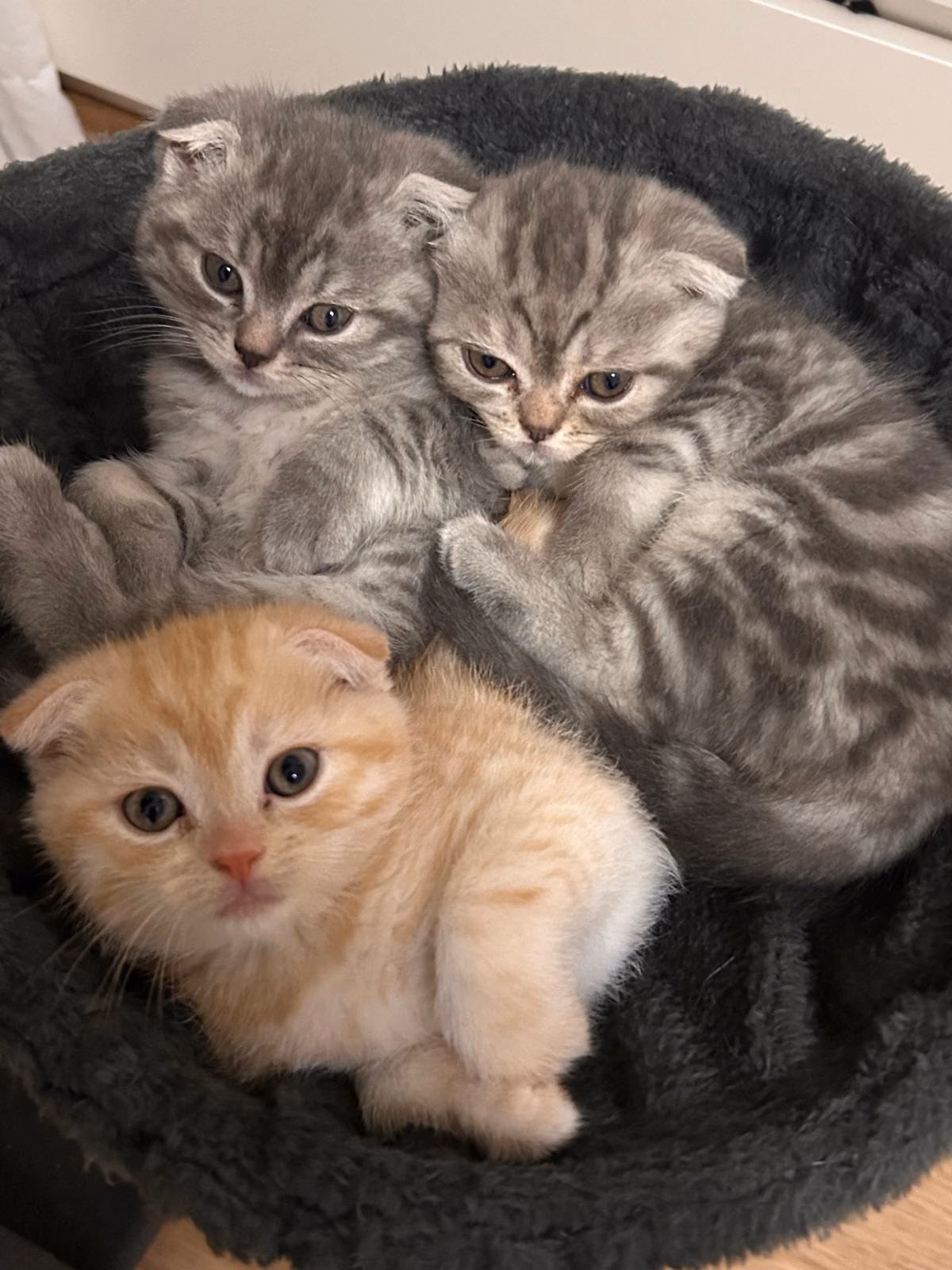 Alle Kitten haben Faltohren, was typisch für den Scottish-Fold-Anteil ist.