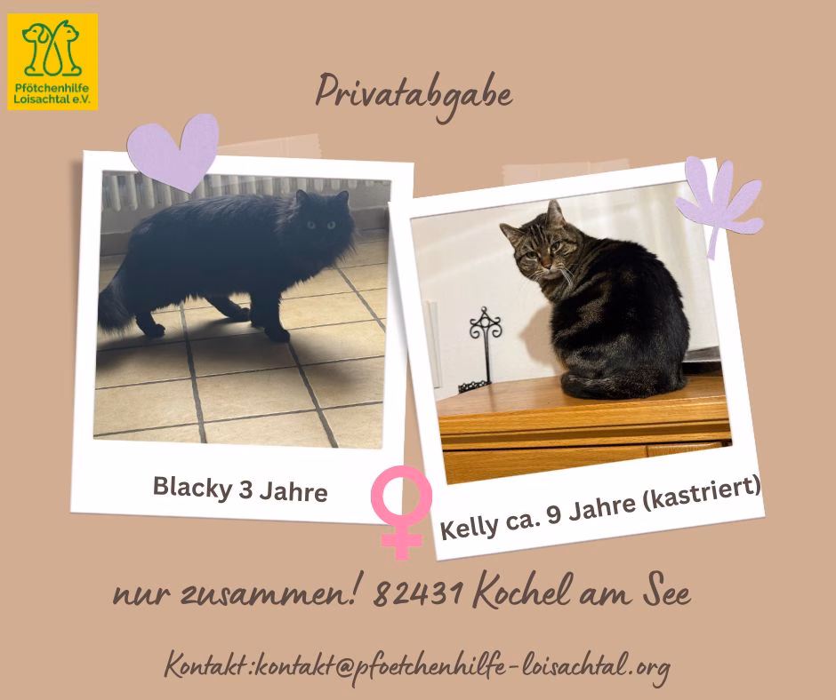 Aufgrund privater Umstände suchen Kelly und Blacky ein neues, dauerhaftes Zuhause. Die beiden Katzen kennen sich gut und können gemeinsam oder – je nach Gegebenheiten – auch getrennt vermittelt werden.
