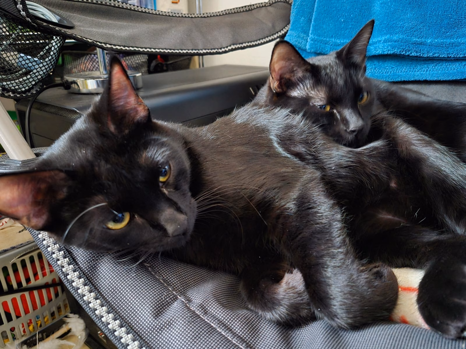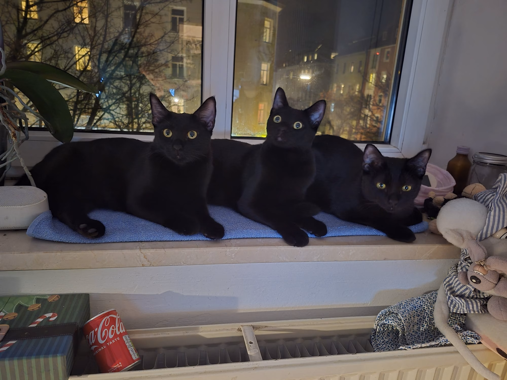 Diese drei kleinen schwarzen Katerchen – alle Brüder – wurden im März 2025 geboren und sind auf ihre Pflegestelle in München. Sie sind typische Jungkater: neugierig, verspielt, lebhaft und einfach zum Verlieben.
