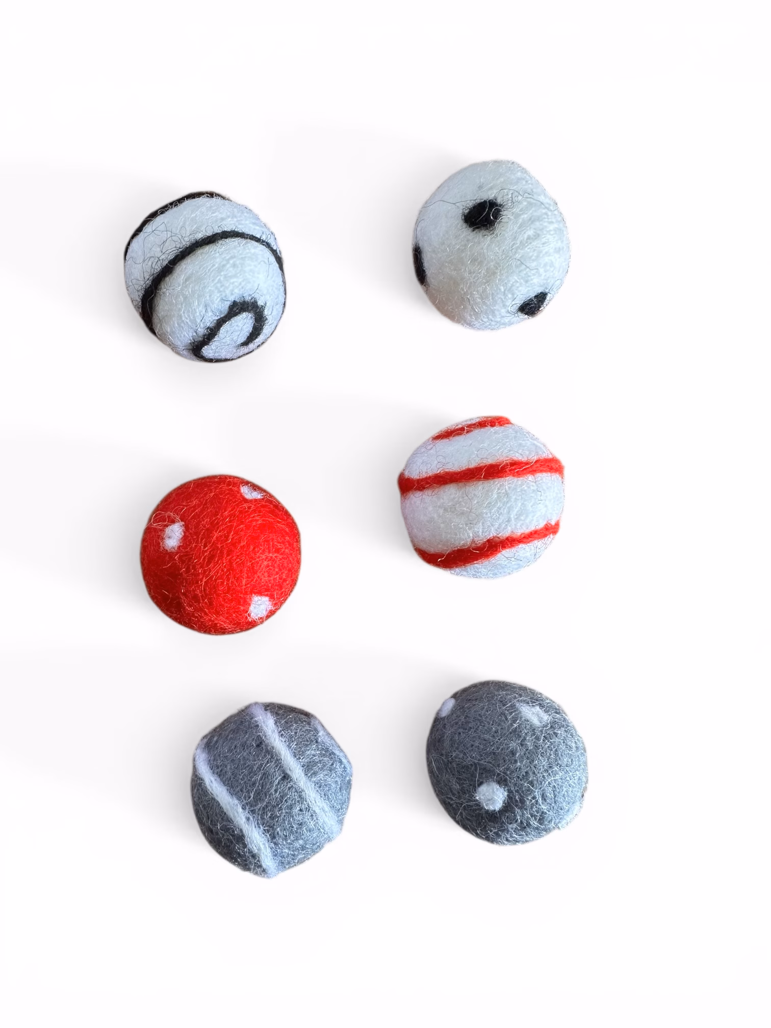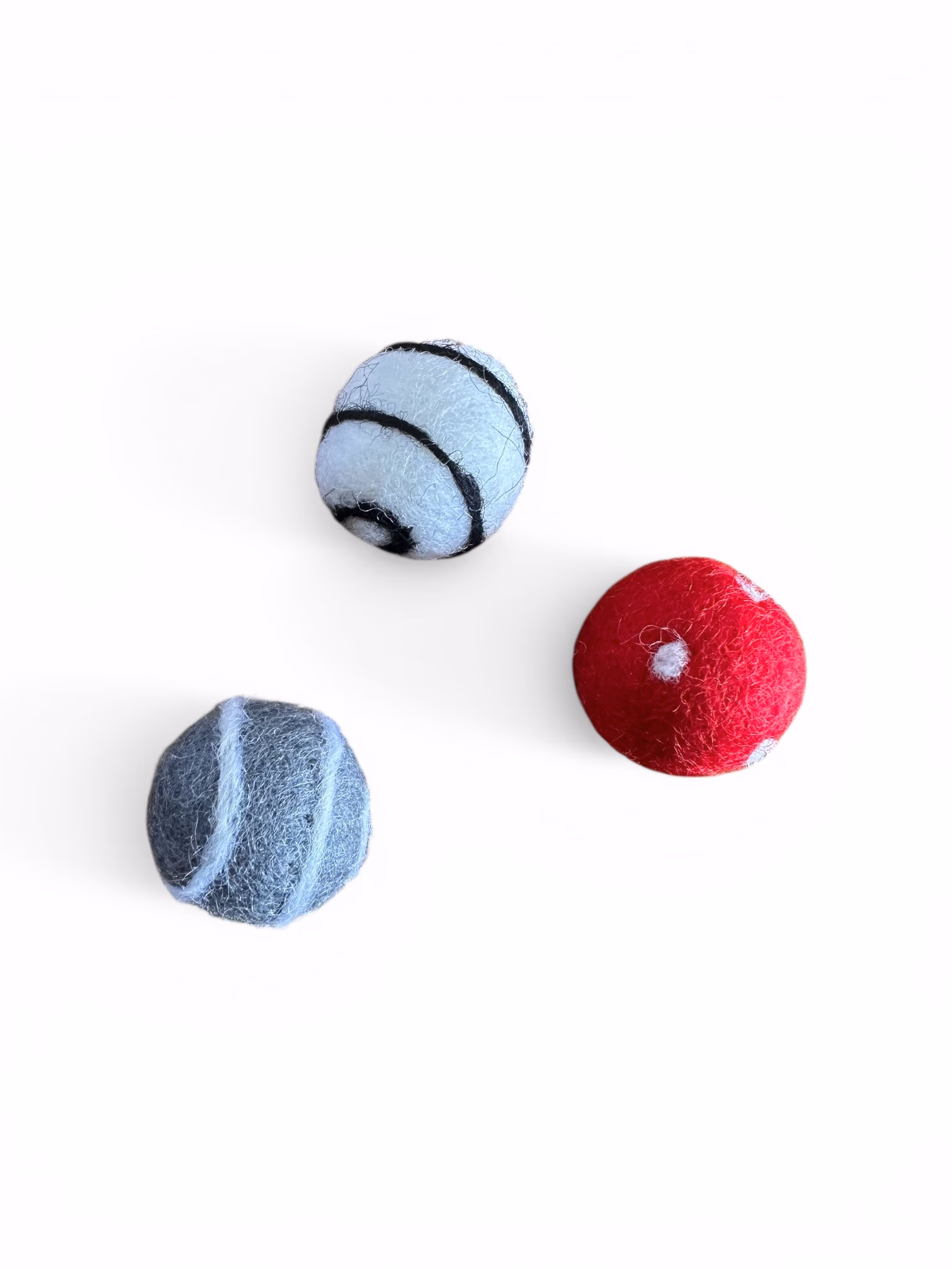 Nachhaltige Katzenspielbälle aus Filz (2 cm) im 3er oder 6er Set. Leicht, robust und ideal zum Spielen und Jagen.